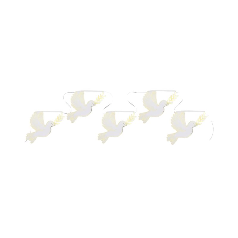 Guirnalda formada por palomas de papel en color blanco ideal para decorar comuniones y otras celebraciones especiales. Medida: 15,7 cm x 5 m.