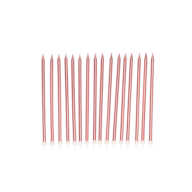 Pack de 12 velas finas y largas en color rosa dorado. Medida: 15 cm. Otros colores disponibles a parte