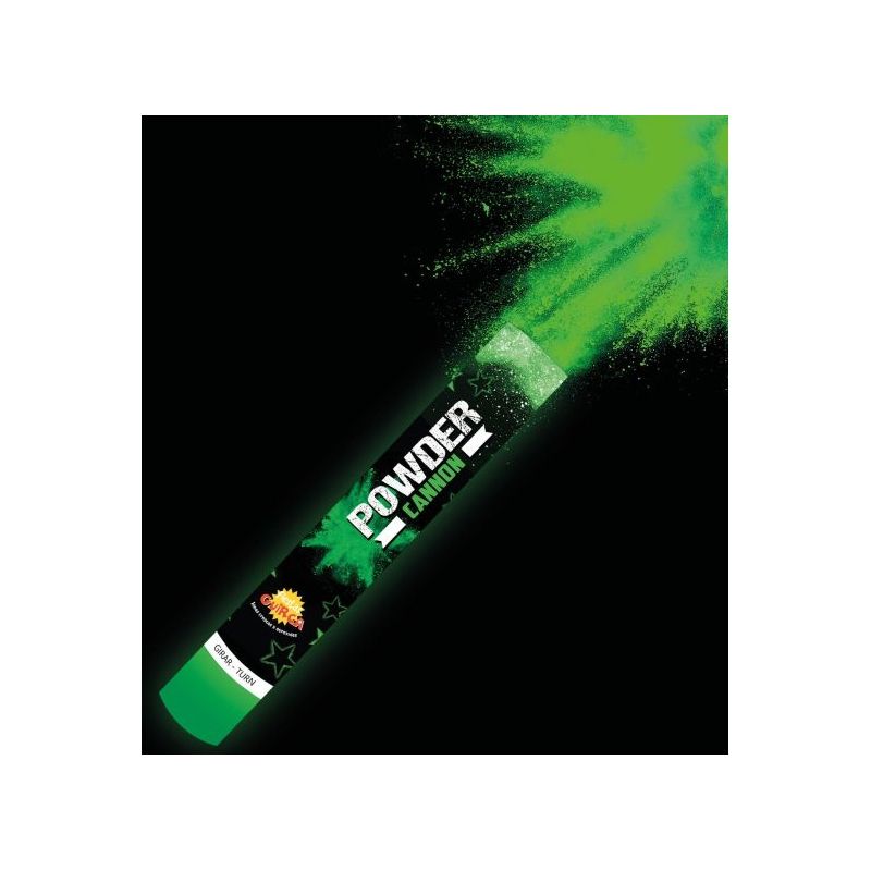 Cañón con aire comprimido relleno de polvo de color verde. Medida: 30 cm. Contiene 30 gramos de polvo. Otros colores disponibles a parte.