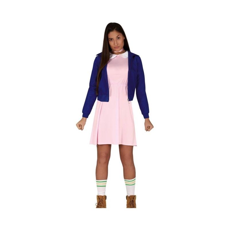 Disfraz de chica telepática ideal para disfrazarse de la niña de Stranger Things en fiestas de Carnaval, Halloween y otras celebraciones. Incluye vestido rosa, chaqueta azul y calcetines. Disponible en talla única de adulto para mujer.