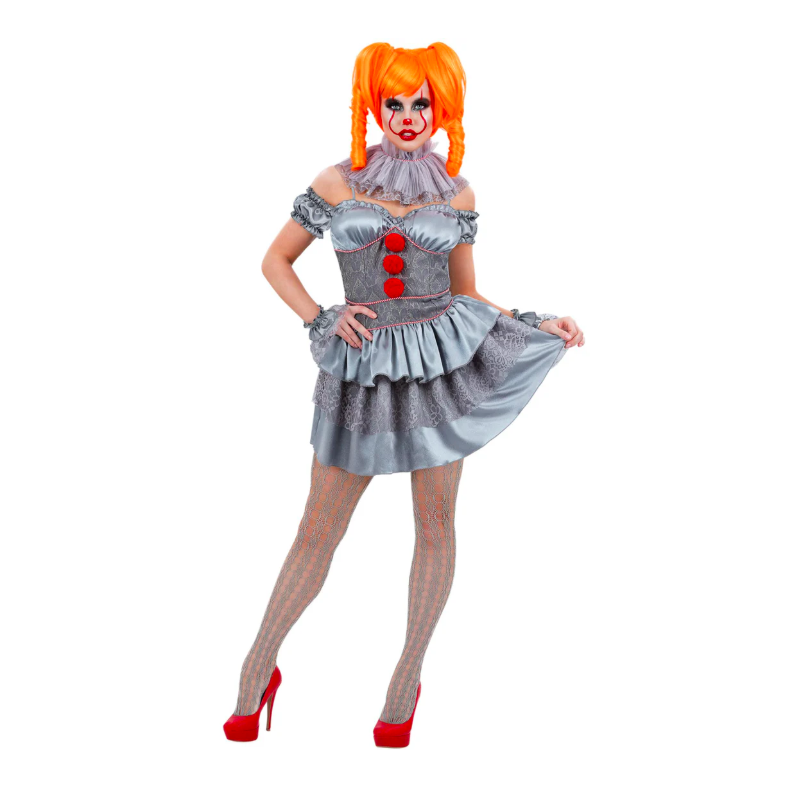 Disfraz de payasa Pennywise para mujer compuesto por vestido, cuello, manguitos y medias a juego. Calidad superior. Disponible en tallas S, M, L y XL.