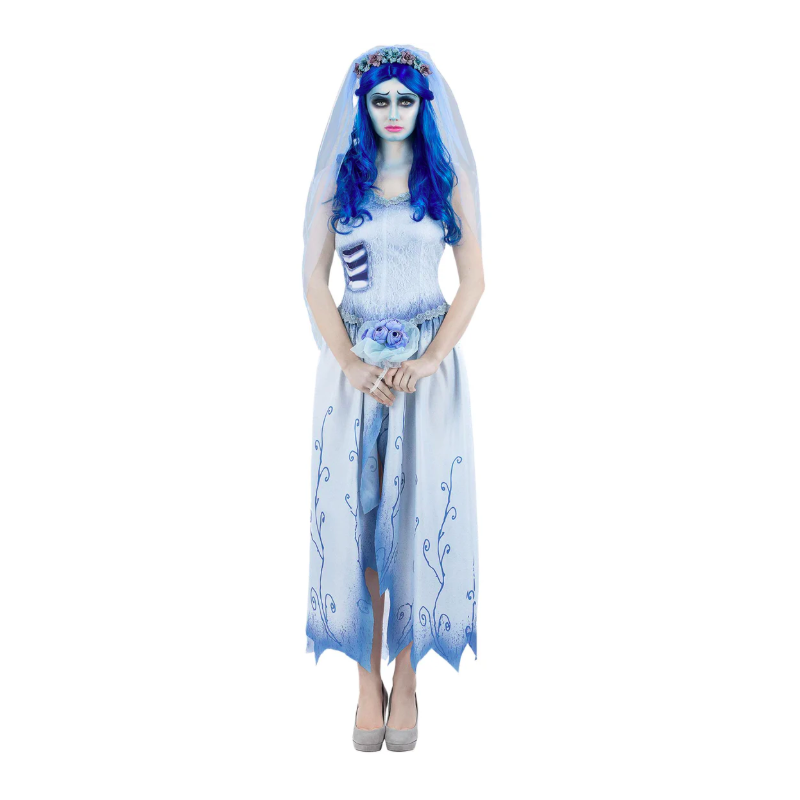 Disfraz de la novia cadáver para mujer compuesto por vestido largo azul y diadema con velo a juego. Disponible en tallas XS, S, M, L y XL.