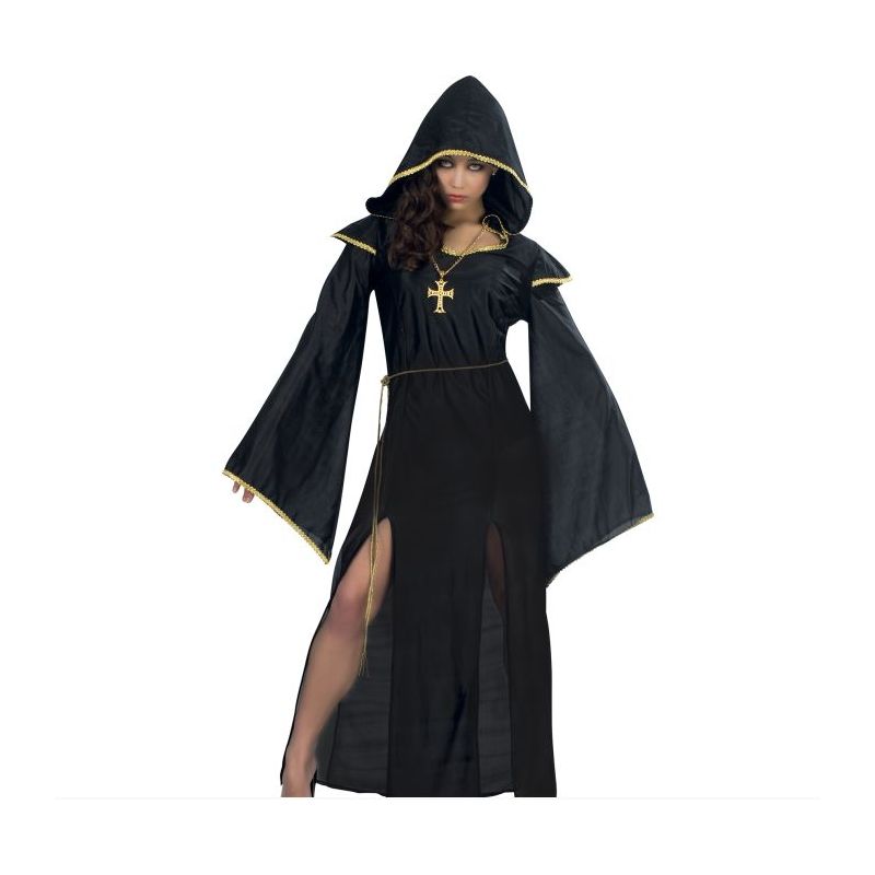 Disfraz de dama de la secta para mujer compuesto por vestido largo con capucha y cinturón. Disponible en talla única de adulto para mujer.
