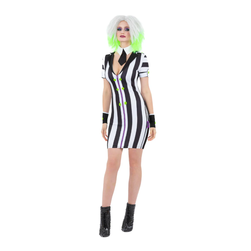 Disfraz de Beetlejuice para mujer compuesto por vestido de rayas, cuello y manguitos. Disponible en tallas XS, S, M, L y XL. Licencia oficial.