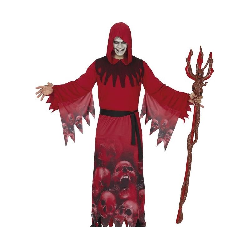 Disfraz de Halloween para hombre ideal para disfrazarse de diablo o demonio compuesto por túnica roja impresa con capucha y cinturón. Disponible en talla única.