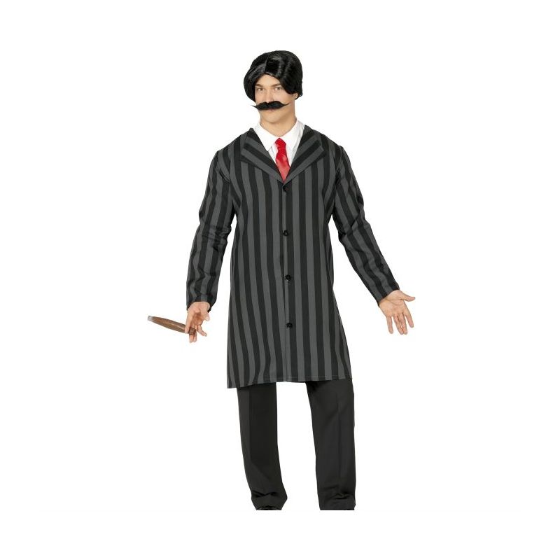 Disfraz de Halloween para hombre ideal para disfrazarse del padre de Miércoles y esposo de Morticia Adams compuesto por chaqueta larga de rayas, camisa y corbata roja. Disponible en tallas M y L.