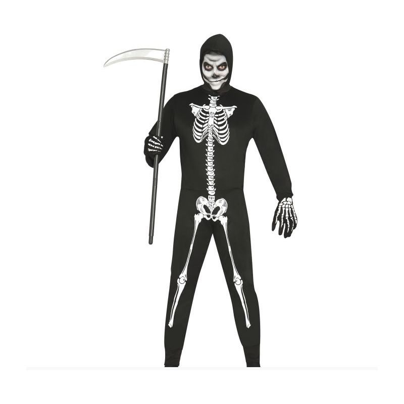 Disfraz de esqueleto para hombre compuesto por mono negro impreso con huesos y capucha ideal para triunfar en tus fiestas de Halloween.