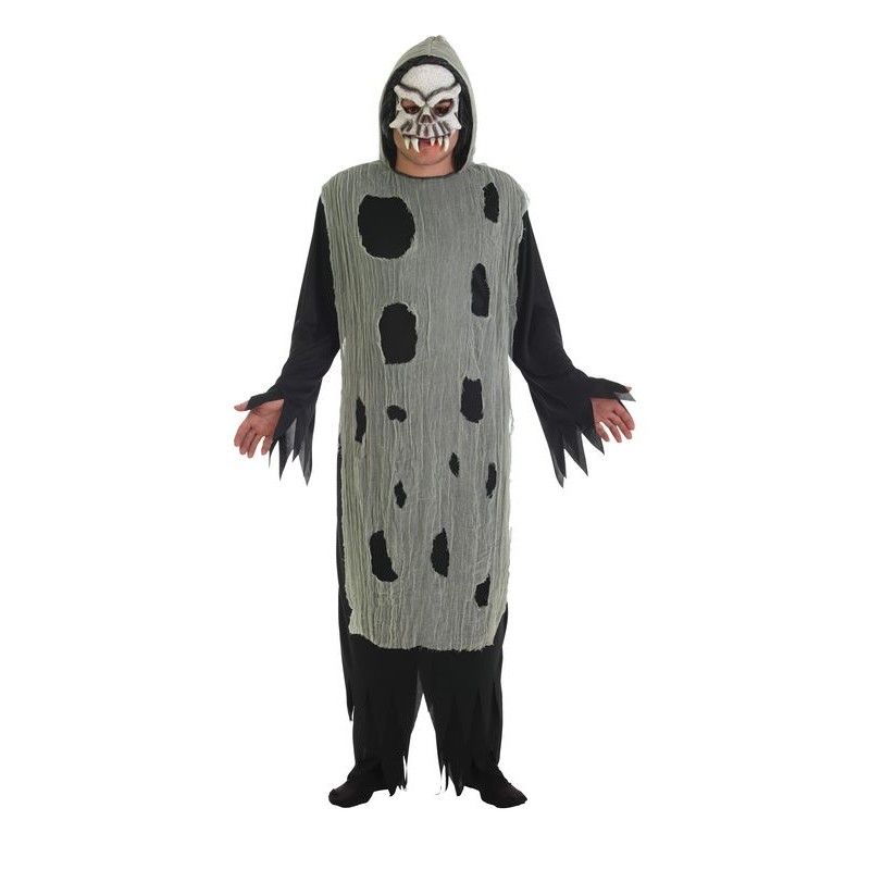 Disfraz de Halloween para hombre compuesto por una túnica larga negra con capucha y una tela gris superpuesta con agujeros.
