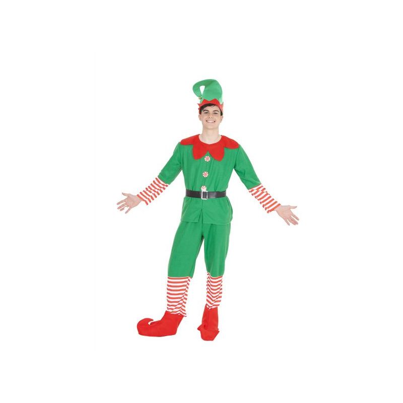 Disfraz de duende de la Navidad o elfo para hombre compuesto por casaca, pantalón, cinturón y sombrero. Disponible en talla única de adulto para hombre.