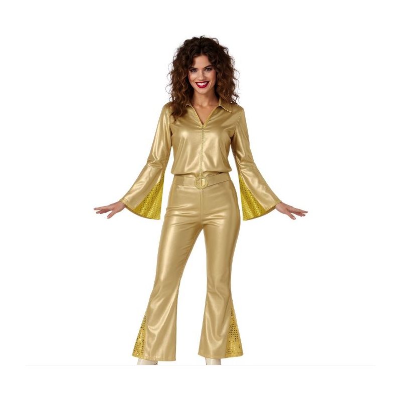 Disfraz disco para mujer ideal para disfrazarse de las integrantes del grupo Abba compuesto por pantalón de campana dorado, camisa a juego y cinturón. Disponible en tallas S, M y L. Otros colores disponibles a parte.