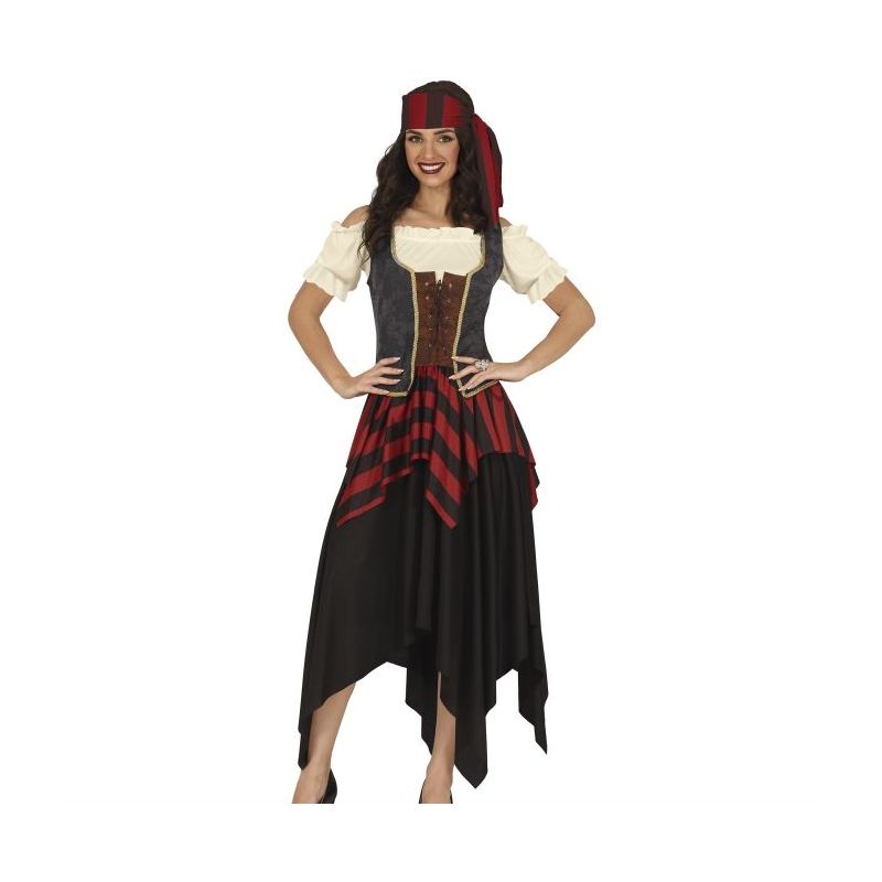 Disfraz de piratesa para mujer compuesto por vestido y corpiño. Disponible en talla única de adulto para mujer.