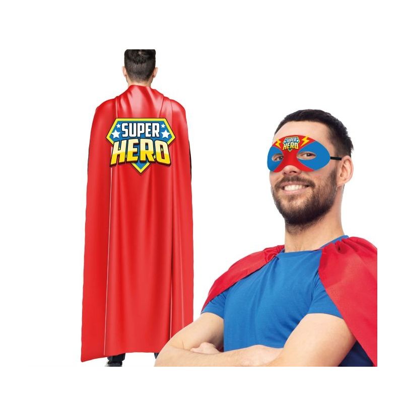 Conjunto de accesorios para disfrazarte de superhéroe compuesto por capa roja impresa y antifaz a juego. Talla única de adulto para hombre.