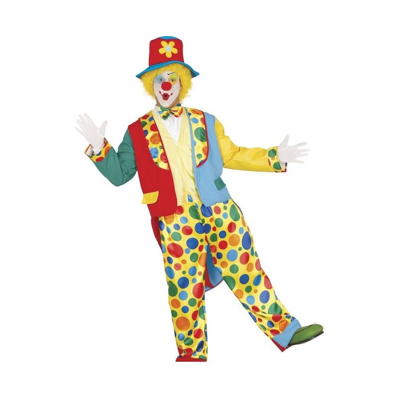Disfraz de payaso para hombre compuesto por chaqueta multicolor con chaleco, pantalón de lunares, pajarita a juego y sombrero. Disponible en tallas M y L para hombre adulto.