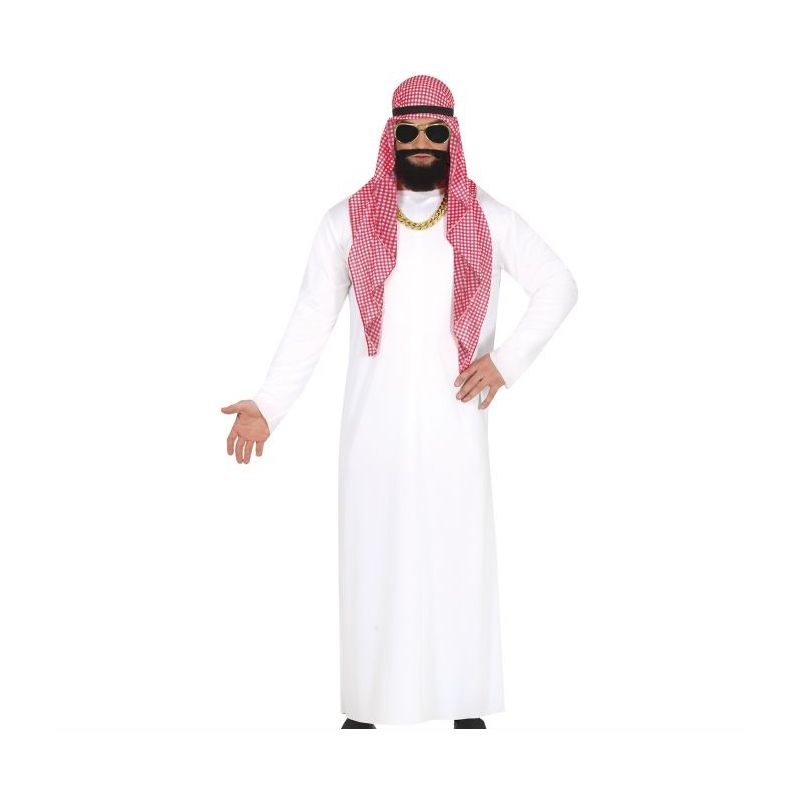 Disfraz de jeque árabe para hombre compuesto por túnica blanca y turbante. Disponible en tallas M y L de adulto para hombre.