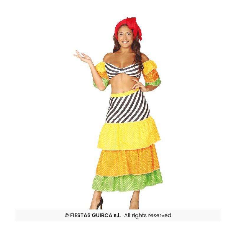 Disfraz de bailarina latina para mujer compuesto por falda de volantes multicolor, top a juego y tocado para la cabeza. Disponible en tallas S, M y L.