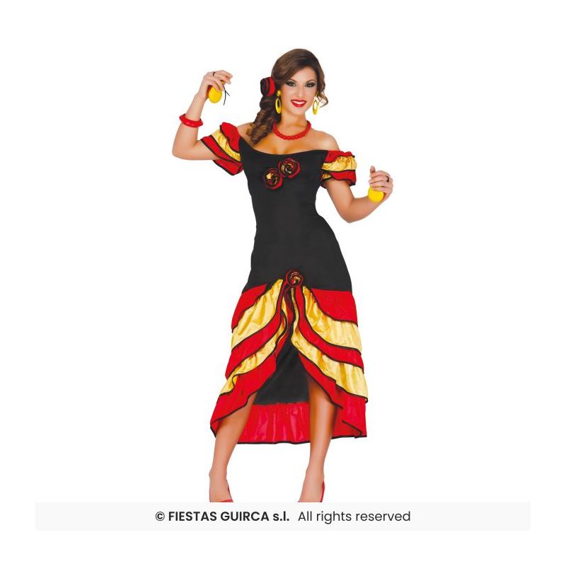 Disfraz de rumbera para mujer compuesto por vestido con volantes rojos y amarillos y tocado de flor a juego. Disponible en tallas S, M y L.