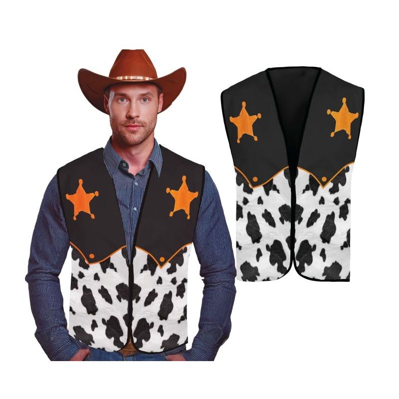 Chaleco negro con estampado animal y estrellas ideal para complementar tus disfraces de vaquero, cowboy o sheriff. Talla única de adulto para hombre.