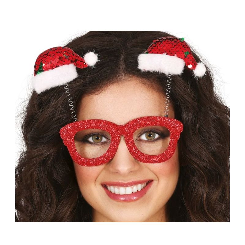 Originales gafas navideñas de purpurina en color rojo con antenas rematadas por mini gorritos de Papá Noel. Talla única de adulto. Otros modelos disponibles a parte.