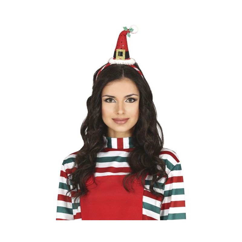 Original diadema con un gorrito mini de Papá Noel ideal para dar un toque divertido a tus looks en estas fechas tan especiales.