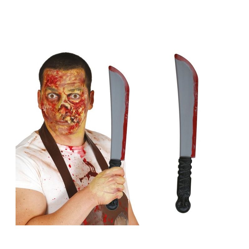 Cuchillo o machete sangriento ideal para complementar tus disfraces de asesino en fiestas de Halloween o Carnaval. Medida: 41 cm de largo. Otros modelos disponibles a parte.