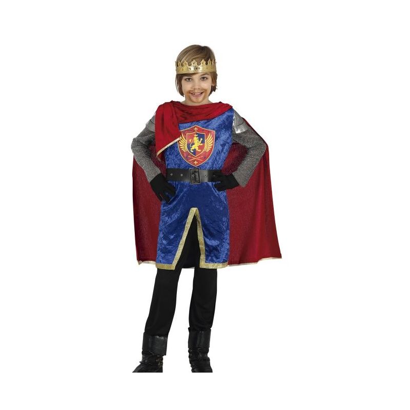 Disfraz de rey medieval infantil para niño compuesto por pantalón, cinturón, casaca y capa. Disponible en tallas para niños de 3-4, 5-6, 7-9 y 10-12 años.