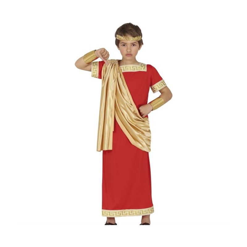 Disfraz de romano infantil para niño compuesto por túnica larga roja y toga dorada. Disponible en tallas para niños de 3-4, 5-6, 7-9 y 10-12 años.