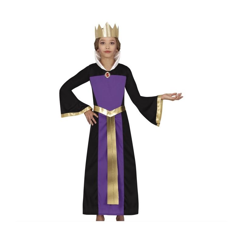 Disfraz de reina de las brujas infantil ideal para disfrazarse de Maléfica compuesto por vestido y corona. Disponible en tallas para niñas de 3-4, 5-6, 7-9 y 10-12 años.