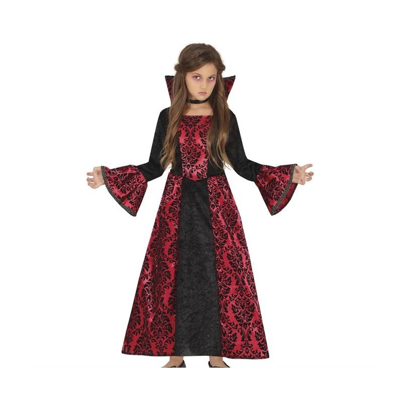 Disfraz de vampiresa infantil compuesto por vestido largo negro y burdeos. Disponible en tallas para niñas de 3-4, 5-6, 7-9 y 10-12 años.