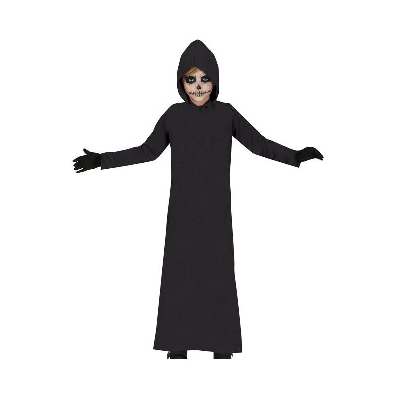 Túnica negra con capucha ideal para utilizar como disfraz de la muerte infantil en fiestas de Halloween. Disponible en tallas para niños y niñas de 5-6, 7-9 y 10-12 años.