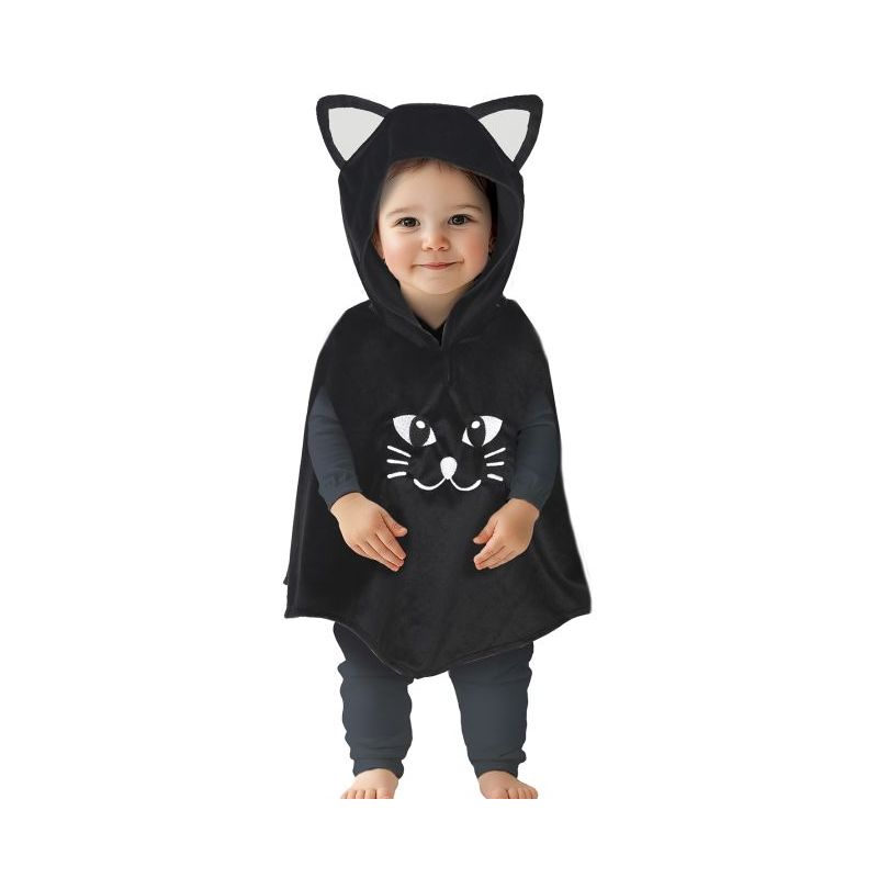 Poncho negro infantil con capucha ideal para disfrazar a tu bebé de gato negro. Disponible en talla única para bebés de 18 a 24 meses.