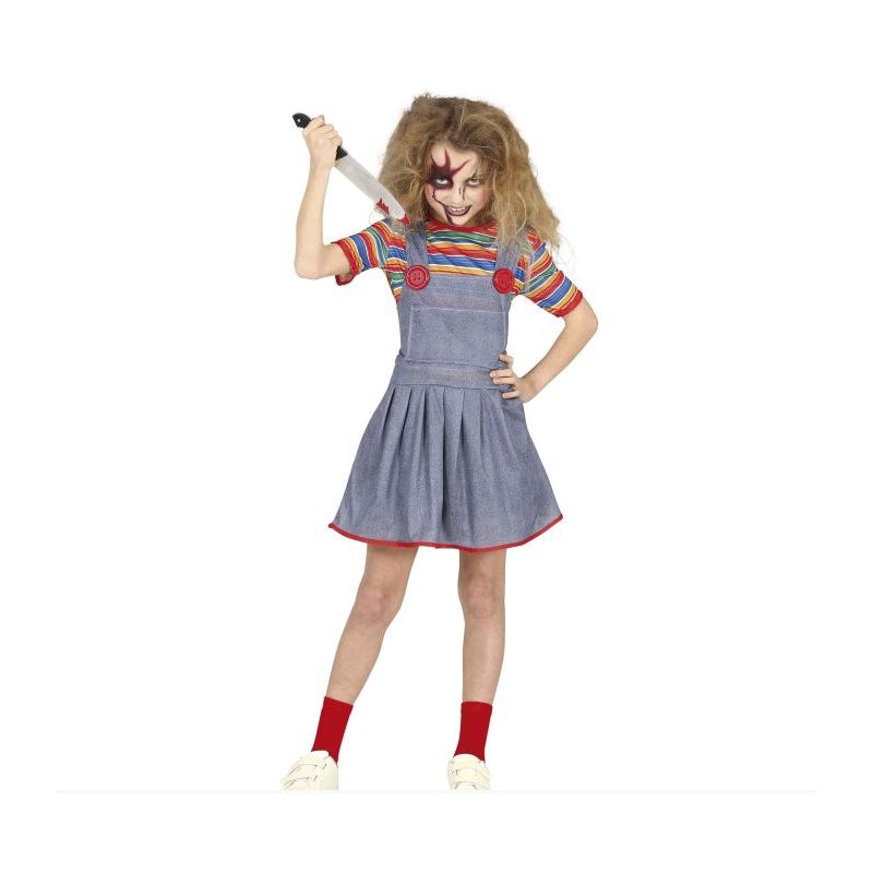 Disfraz de la muñeca de Chucky en versión infantil compuesto por vestido y camiseta de rayas. Disponible en tallas para niñas de 5-6, 7-9 y 10-12 años.