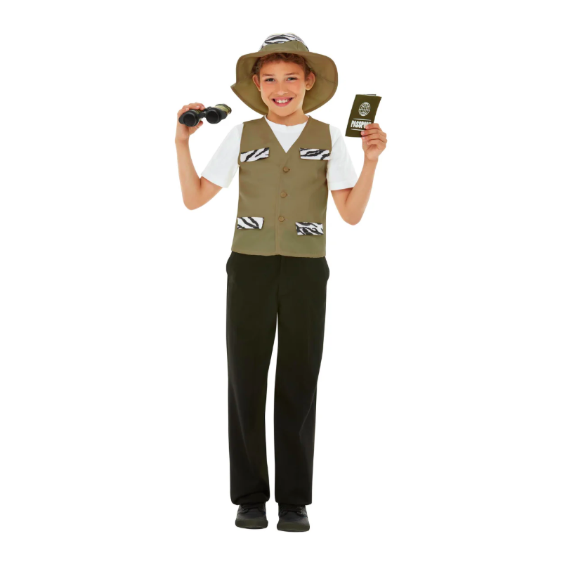 Disfraz de explorador infantil compuesto por chaleco, sombrero, prismáticos, pasaporte e insignias. Ideal también para disfrazarse de arqueólogo, director de safari, aventurero y otras temáticas.