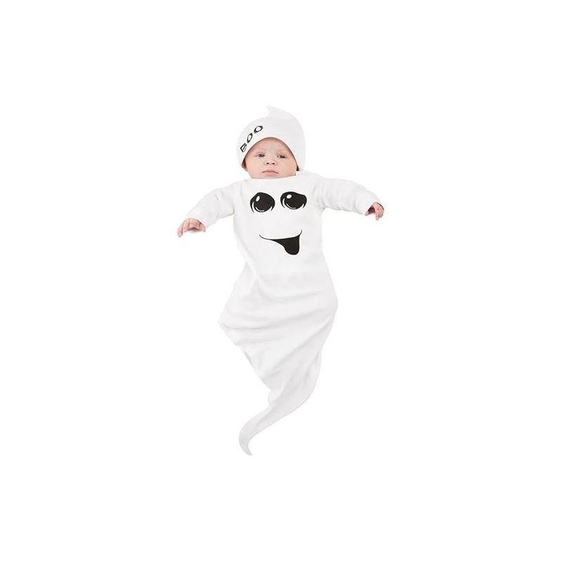 Disfraz de fantasma para bebé compuesto por un original trajecito blanco con gorro a juego.