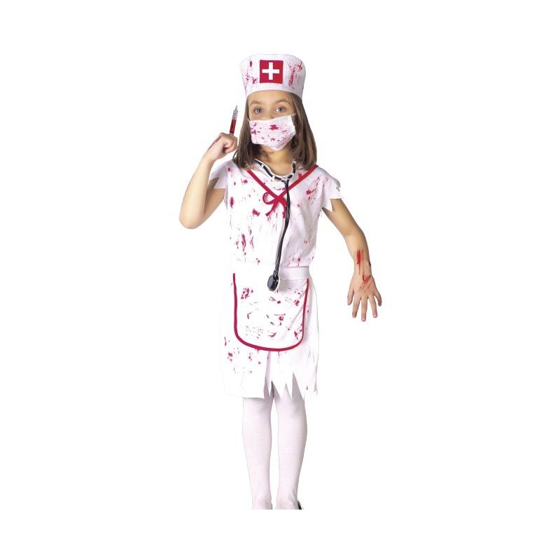 Disfraz de enfermera zombie infantil compuesto por un vestido blanco ensangrentado, delantal, cofia y mascarilla a juego. Disponible en tallas para niñas de 5-6, 7-9 y 10-12 años.