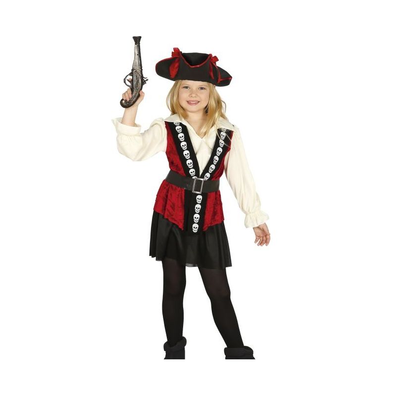 Disfraz de piratesa infantil para niña compuesto por vestido, cinturón y gorro. Disponible en tallas para niñas de 3-4, 5-6, 7-9 y 10-12 años. Otros accesorios de pirata disponibles a parte para completar el look.