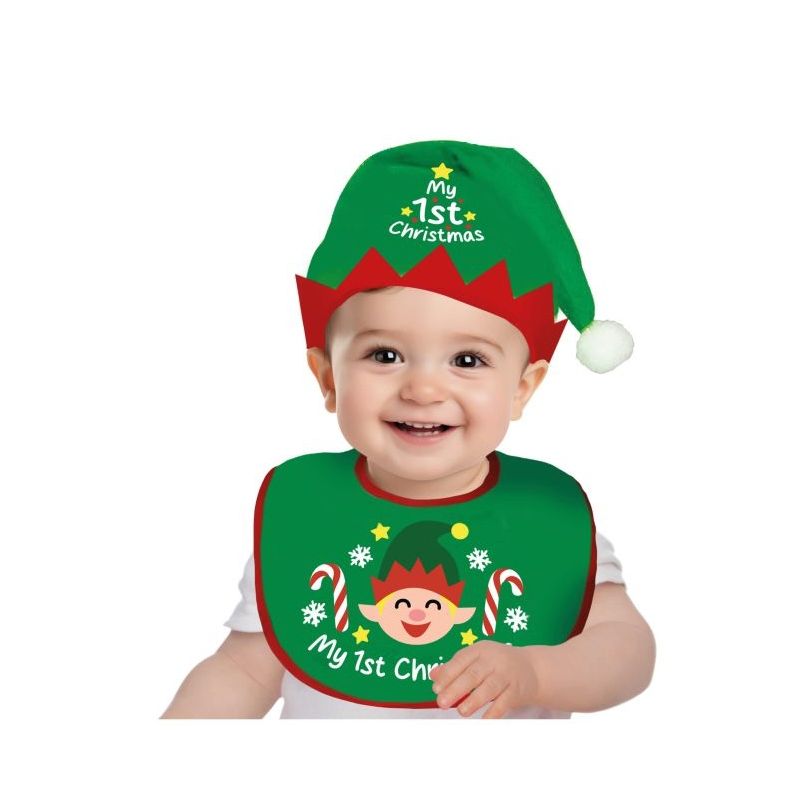 Original set de babero con gorrito ideal para disfrazar a tu bebé de elfo duende en fiestas de Navidad. Otros modelos disponibles a parte.