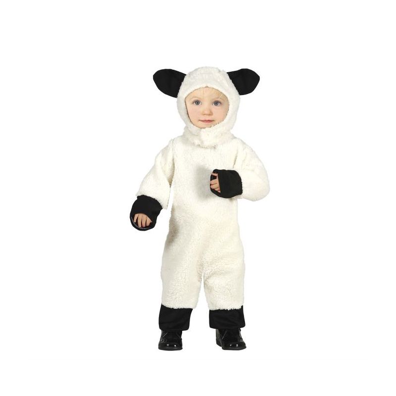 Disfraz de ovejita para bebés compuesto por un calentito traje de borrego blanco y capucha a juego. Disponible en tallas para bebés de 12 a 18 y de 18 a 24 meses.