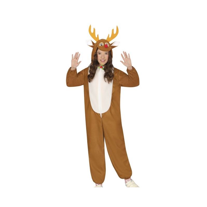 Disfraz de reno infantil para niño o niña compuesto por un mono de cuerpo entero marrón y capucha con cuernos a juego. Disponible en tallas para niños de 3-4, 5-6, 7-9 y 10-12 años.
