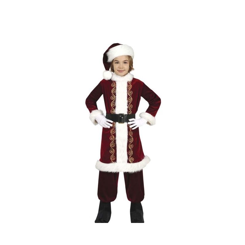 Disfraz de Papá Noel infantil para niño compuesto por una casaca larga de terciopelo burdeos bordada con dibujos dorados, pantalón a juego, cinturón y gorro. Disponible en tallas para niños de 3-4, 5-6, 7-9 y 10-12 años.