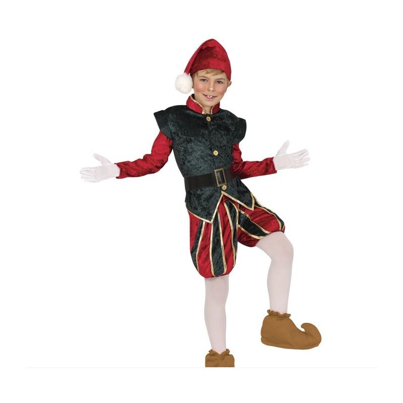 Disfraz de paje ayudante de Santa Claus infantil compuesto por una casaca de terciopelo, pantalón a juego en los mismos tonos, cinturón y gorro. Disponible en tallas para niños de 3-4, 5-6, 7-9 y 10-12 años.
