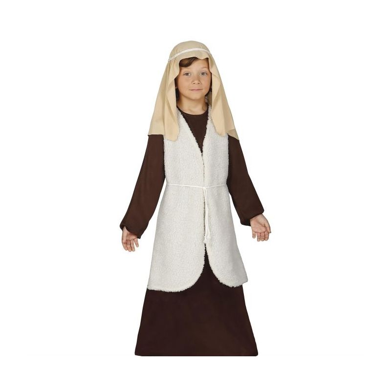 Disfraz de hebreo infantil para niño compuesto por túnica larga marrón, chaleco de borrego, cinturón y tocado tipo turbante a juego. Ideal para disfrazar a tu pequeño de San José en versión pastor estas Navidades. Disponible en tallas para niños de 3-4, 5-6, 7-9 y 10-12 años.