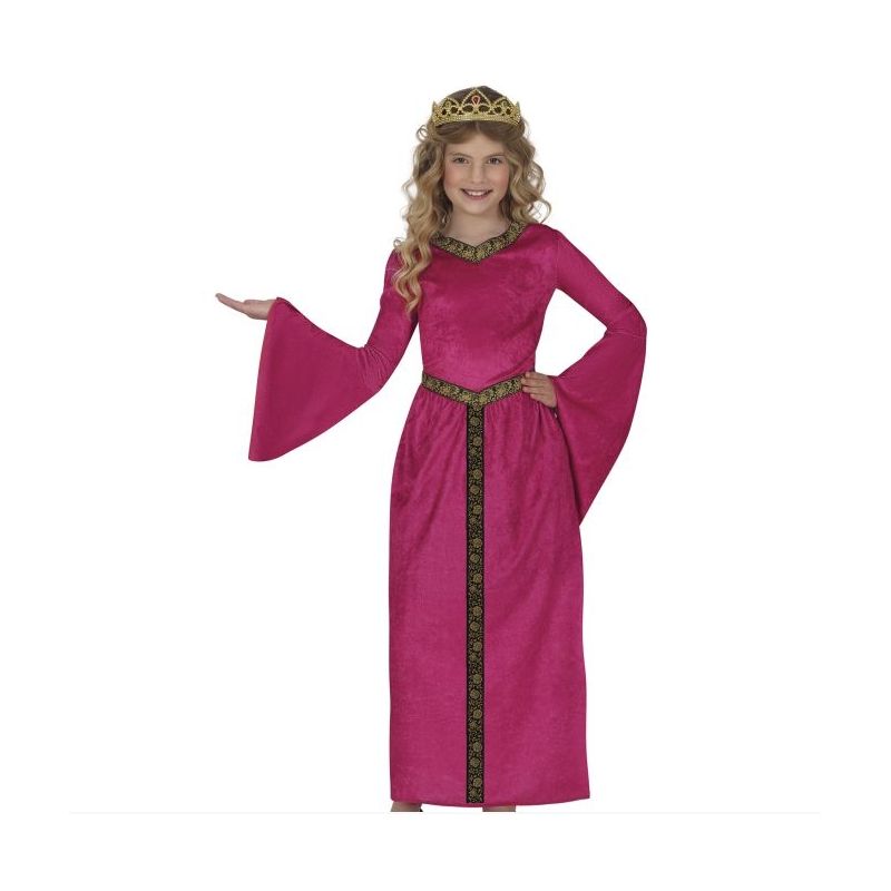 Disfraz de princesa medieval infantil compuesto por un vestido largo de terciopelo de color burdeos. Disponible en tallas para niñas de 5-6, 7-9 y 10-12 años.