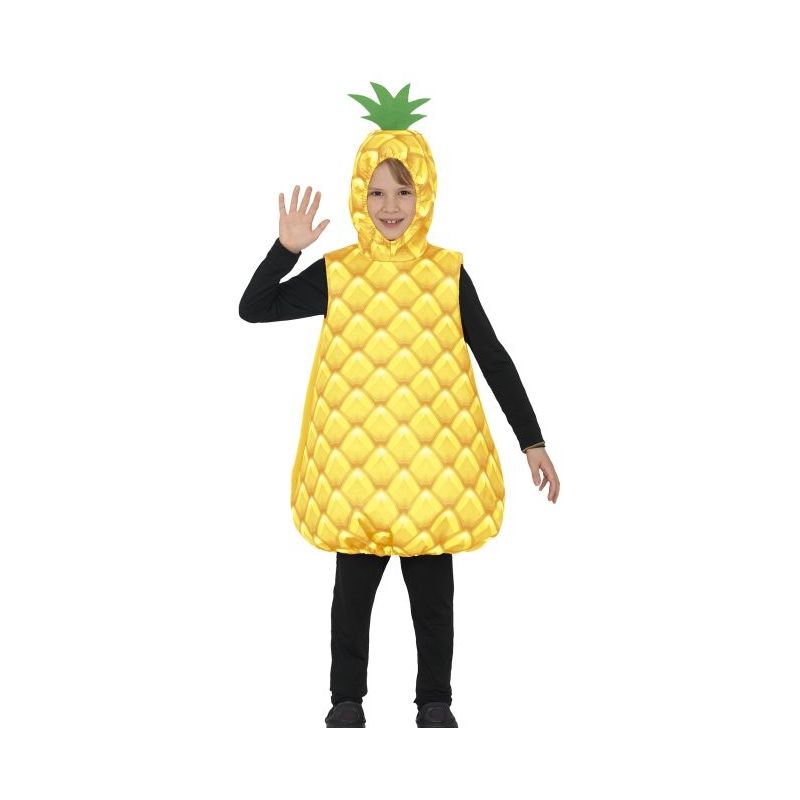 Disfraz de la fruta piña infantil compuesto por un traje amarillo con capucha. Disponible en tallas para niños y niñas de 5-6, 7-9 y 10-12 años. Unisex.