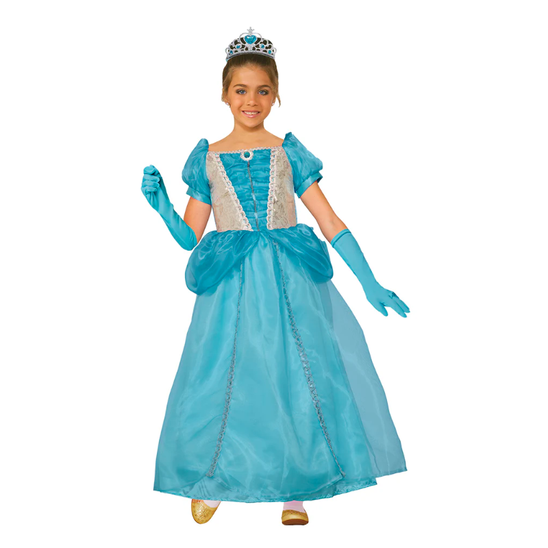 Disfraz de princesa infantil compuesto por un precioso vestido largo de color turquesa. Disponible en tallas para niñas de 3-4, 5-7 y 7-8 años.