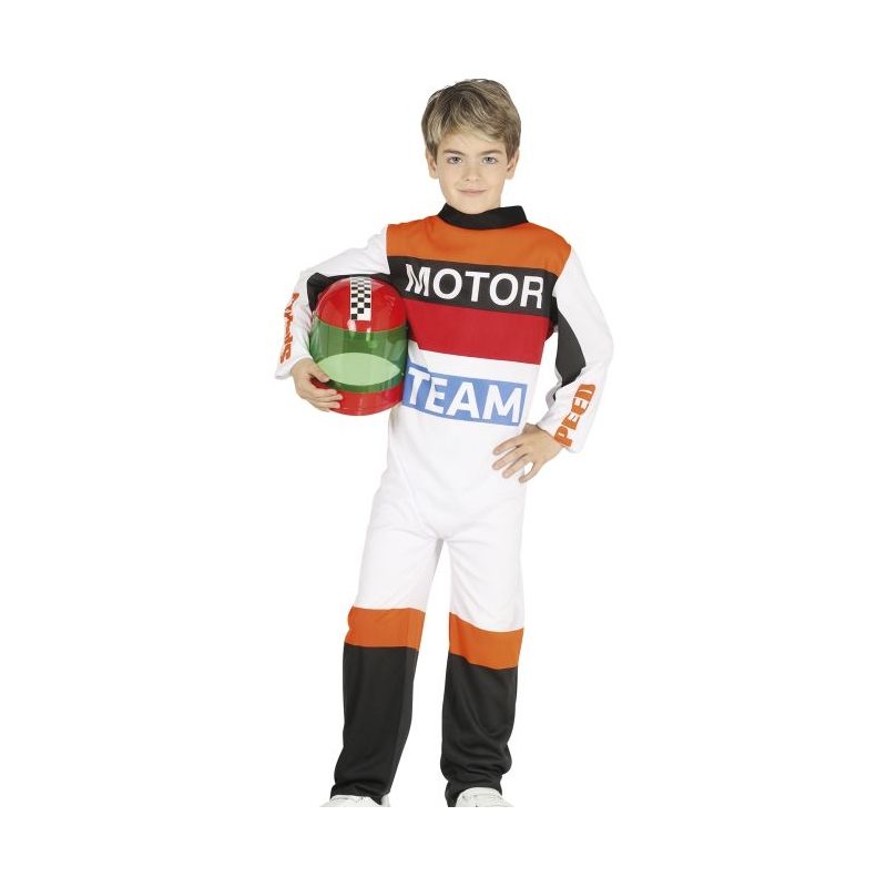 Disfraz de piloto de motos de carrera infantil compuesto por mono jumpsuit. Disponible en tallas para niños de 5-6, 7-9 y 10-12 años.
