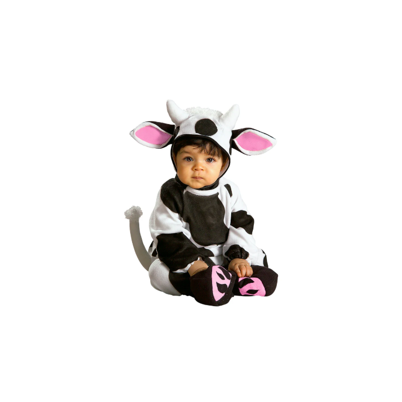 Disfraz de vaca infantil compuesto por un mono pelele de cuerpo entero y gorrito a juego. Talla única para niños y niñas de 1 a 2 años.