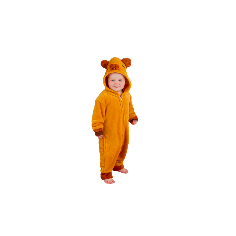 Disfraz de capibara infantil compuesto por un calentito traje pelele marrón con capucha y cremallera frontal. Disponible en talla única para bebés niños y niñas de 12 a 18 meses.