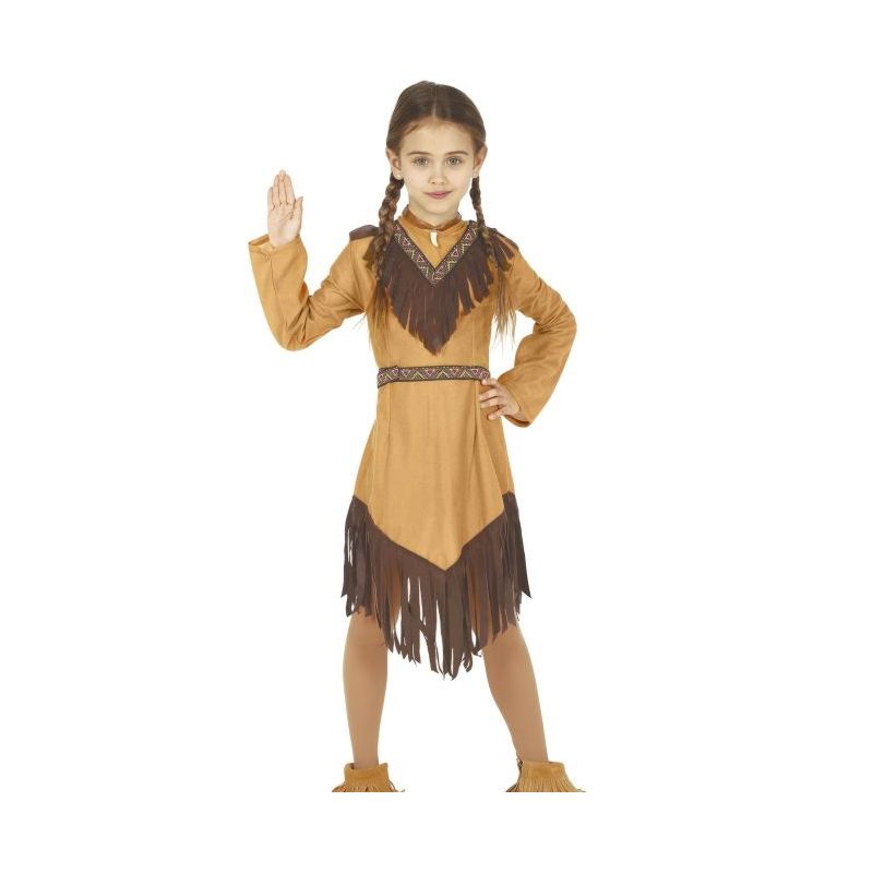 Disfraz de india infantil compuesto por vestido marrón con flecos y cinturón a juego. Disponible en talla única para niñas de 3 a 4 años.