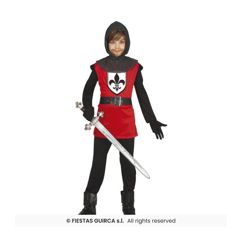Disfraz de rey medieval infantil compuesto por casaca, cinturón, pantalón y gorro. Disponible en tallas para niños de 3-4, 5-6, 7-9 y 10-12 años.