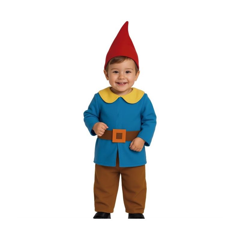 Disfraz de gnomo o enanito para bebé compuesto por casaca, pantalón, cinturón y gorro. Disponible en tallas para niños bebés de 12 a 18 y de 18 a 24 meses.